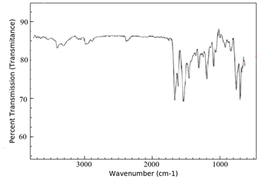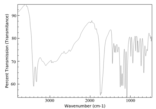FTIR spectra of lopinavir, tartaric acid, and the co-crystal L5 are shown in Figure 3. The FTIR spectra of lopinavir revealed peaks at 3460 cm-1 and 3350 cm-1, which correspond to the -OH and N-H stretching bands, respectively, as shown in Figure 3a. The C-H frequency for aromatic and aliphatic carbons was observed from 2850 cm-1 to 3080 cm-1. The frequency of the C=O amide functional group was noted at 1660 cm-1 and 1530 cm-1. The stretching peak of C–N was evident at 1450 cm-1. Similar FTIR spectrum for lopinavir was reported by various investigators.19,21. The FTIR spectrum of tartaric acid (Figure 3b) showed the stretching vibration of a hydroxyl function group by wave number 3400 cm-1, followed by the C=O carboxylic acid bond at wave number 1750 cm-1 and the C-O bond at wave number 1090 cm-1.25