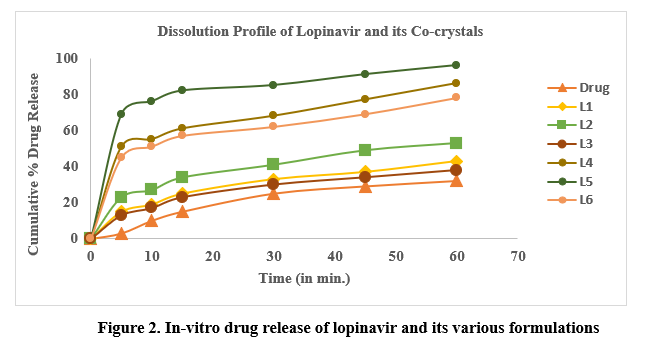 The co-crystals were prepared successfully using tartaric acid coformer by neat dry grinding and liquid assisted grinding methods indicated by good content uniformity. For lopinavir, co-crystals L5 showed better solubility and dissolution. The dissolution study of lopinavir showed 96% drug release in 60 minutes in the co-crystal L5. The computed % Q5 values for this co-processed mixture was 67% and the calculated DE for the same tested formulation was 78.88%. This indicates that L5 co-crystals showed faster drug release compared to other co-crystals as well as pure drug. This enhancement in lopinavir dissolution rate in case of the formulations containing lopinavir and tartaric acid can be accredited to formation of a new crystalline species with weaker crystallinity due to possible hydrogen bond interaction with coformer. The interaction between lopinavir and tartaric acid was further confirmed by FTIR, DSC and XRD studies. In conclusion, the cocrystallization of lopinavir with water-soluble conformer tartaric acid prepared by solvent assisted dry grinding method might be considered as a promising approach with improved solubility and dissolution rate.