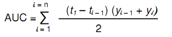 where y is a function of the percentage of drug dissolved at time t D.E. is the area under the dissolution curve between time points t1 and t2 expressed as a percentage of the curve at maximum dissolution, y100, over the same time period. The integral of the numerator, that is, the area under the curve, is calculated using a model-independent method, the trapezoidal method. The area under the curve is the sum of all trapeziums defined by Equation 2: