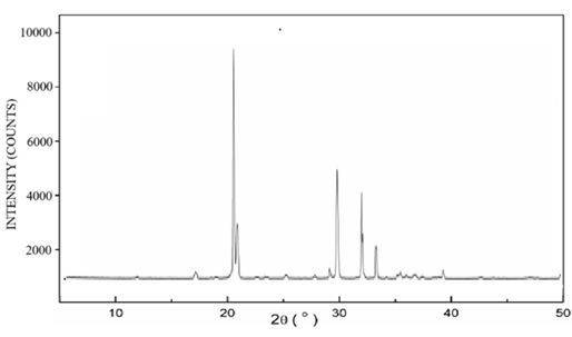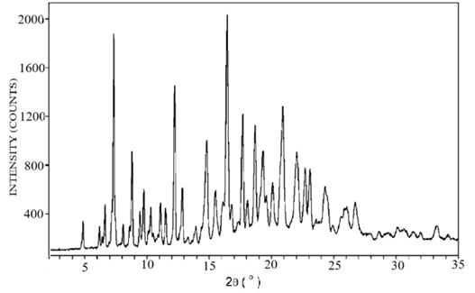 The diffraction patterns of pure lopinavir, tartaric acid, and co-crystal L5 are shown in Figure 5. The diffraction pattern of pure lopinavir (Figure 5a) showed high-intensity peaks at 2-theta values of 4.9°, 7.4°, 8.5°, 9.7°, 12.4°, 12.8°, 14.8°, 16.3°, 17.4°, 18.3°, 20.9°, and 21.8°, suggesting its crystalline nature. The diffraction pattern of tartaric acid (Figure 5b) showed peaks at 20.7°, 21.2°, 28.2 °, 29.8 °, 32.8 °, and 33.4 o whereas in diffraction pattern of co-crystal L5 (Figure 5c), some peaks were displaced and some were absent.