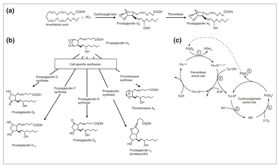 Figure 2: Production of prostaglandins by COXs. (a) The two reactions performed by cyclooxygenases: the conversion of arachidonic acid to prostaglandin G2 by the cyclooxygenase activity and the conversion of prostaglandin G2 to prostaglandin H2 by the peroxidase activity. (b) The cell-specific synthases that are involved in the conversion of prostaglandin H2 to the five principal prostaglandins. (c) The reaction mechanism of COX-1.