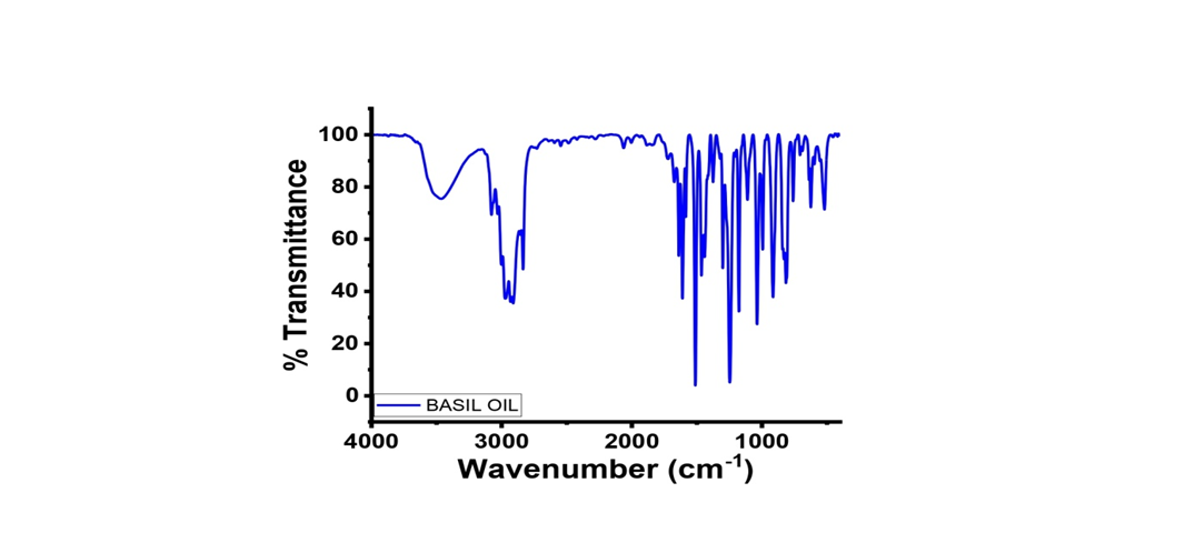 The comparative study of FT-IR (Fourier Transform Infrared) spectroscopy [19] for the recognition of various functional groups presentin Ocimum basilicum L. Infrared spectroscopy characterization of Basil oil communicates the existence of various functional groups with intensity peak of phenol groups, O-H stretching, or hydrogen bonding, C-H stretching bonding which is associated with alkynes and alkanes, C-X bonding which is for alkyl halide groups, C=O stretching frequency which describe the ketone, aldehyde, esters and amides. These functional groups of bioactive compounds contain linalool, camphor, methyl chavicol, eugenol, and 1,8-cineole. FTIR (Fourier-transform infrared) spectroscopy [20] is a technique used to analyze the chemical composition and functional groups in basil essential oil samples from different sources or under various conditions.
