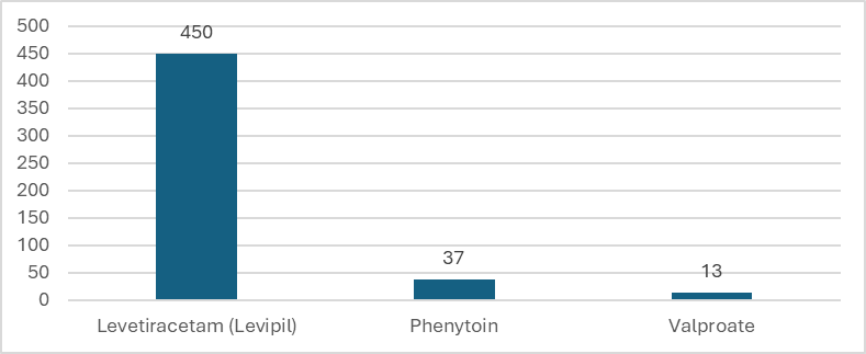Among the 500 patients evaluated for preventive antiepileptic therapy, Levetiracetam (Levipil) was the most commonly administered agent, used in 450 cases (90%). Phenytoin was given to 37 patients (7.4%), while Valproate was used in only 13 cases (2.6%). This data indicates a strong preference for Levetiracetam as the primary choice for seizure prophylaxis, likely due to its favourable seizure stabilization profile and ease of use compared to older antiepileptics.