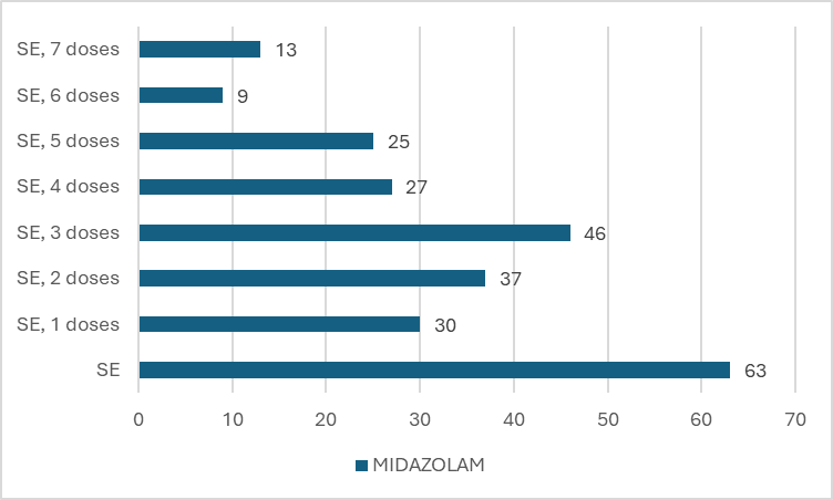 In conclusion, the findings from the chi-square analysis and therapy duration evaluation highlight the superior efficacy of lorazepam over midazolam as evidenced by its requirement for fewer doses to achieve seizure control regardless of the seizure etiology.