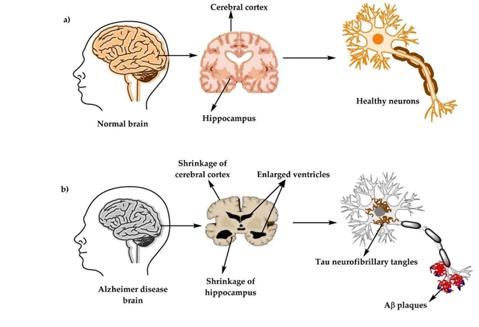 Alzheimer’s disease (AD) is a progressive neurodegenerative disorder and the leading cause of dementia worldwide, accounting for nearly 60–70% of cases. The literature describes AD as a multifactorial condition characterized by the accumulation of amyloid-β (Aβ) plaques, neurofibrillary tangles composed of hyperphosphorylated tau, oxidative stress, and chronic neuroinflammation. Early studies focused primarily on the amyloid cascade hypothesis, proposing that abnormal cleavage of amyloid precursor protein leads to Aβ aggregation and neuronal toxicity. Subsequent research expanded the understanding of AD pathogenesis by highlighting tau pathology, mitochondrial dysfunction, cholinergic neuron loss, and vascular contributions such as reduced cerebral perfusion and blood–brain barrier breakdown.