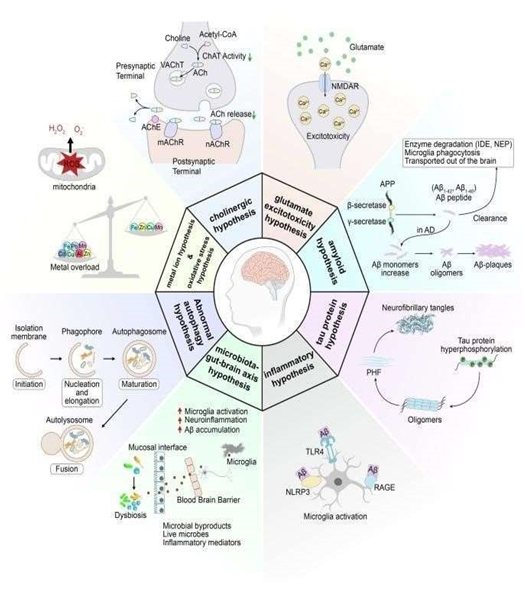 The exact disease mechanism of Alzheimer’s disease is still not fully understood. However, two major pathological features are consistently observed. The first is the buildup of amyloid-β (Aβ) fragments, which form plaques around the outside of neurons. The second is the presence of abnormal, twisted tau protein strands—known as neurofibrillary tangles—inside the neurons. Over the years, multiple theories have been proposed to explain how these abnormalities contribute to the development and progression of AD, as outlined below.(9)