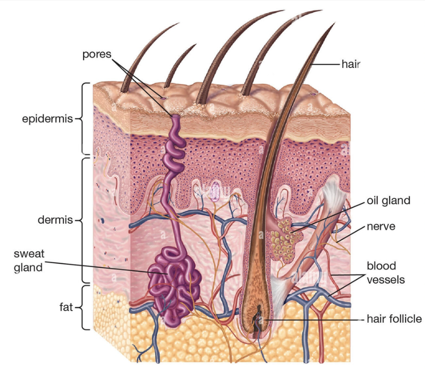 Most of the topical preparations are meant to be applied to the skin. So basic knowledge of the skin and its physiology function are very important for designing topical. The skin of an average adult body covers a surface area approximately 2mm and receives about one third of the blood circulating through the body. An average human skin surface is known to contain, on the average 40-70 hair follicles and 200-300 sweat ducts on every square centimeter of the skin. The pH of the skin varies from 4 to 5.6. Sweat and fatty acid secreted from sebum influence the pH of the skin surface. The skin can be considered to have four distinct layers of tissue as shown in figure.2