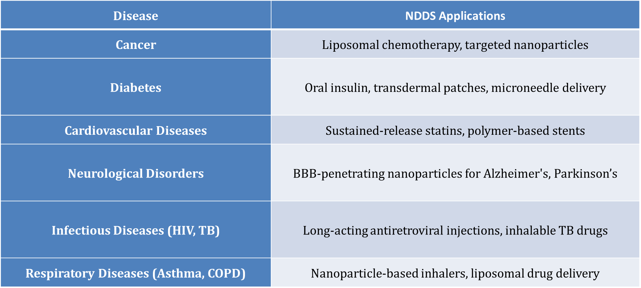• Targeted Drug Delivery: NDDS (e.g., nanoparticles, liposomes) guides chemotherapy medications specifically to cancer cells, decreasing damage to healthy tissues.