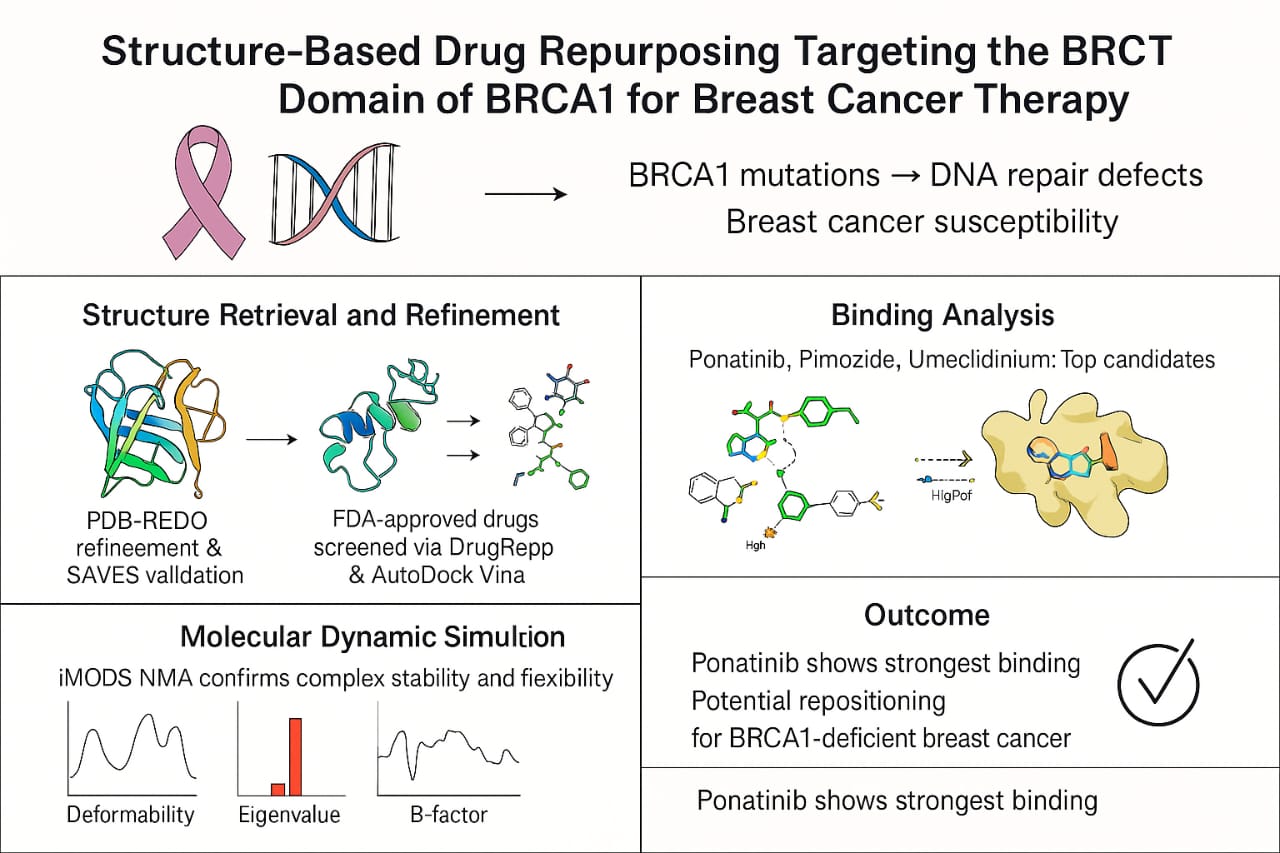 Breast neoplasms comprise the highest numbers of diagnoses made in women and are also a major cause of death associated with cancer in women worldwide [1]. Advances have been made in terms of diagnostics and treatment, but therapy resistance, recurrence of disease and genetic heterogeneity persist as challenges to effective treatment [2]. Mutations in the Breast Cancer Type 1 Susceptibility Protein (BRCA1) are one of the most important genetic causes of breast cancer [3]. BRCA1 is tumor suppressor protein [4]. This protein has to be provided because it keeps the genomic integrity intact [5]. It is concerned with several cellular processes such as the repair of DNA damage (particularly through homologous recombination, transcription regulation, chromatin remodeling, and cell cycle control within a cell [6]. Mutations of this gene lead to impairment of these protective mechanisms that accumulate DNA damage and instability in the genome and susceptibility to cancers [7]. The BRCT (BRCA1 C-Terminal) domain is one of the most critical functional regions of the BRCA1 protein; this region recognizes and binds phosphoprotein partners, such as BACH1 helicase, in a DNA damage response pathway [8]. BACH1, a helicase, constitutes a major part of the BRCT domain of BRCA1 as represented by the 1T15 crystal structure that shows it bound with a phosphorylated peptide derived from BACH1 [9]. This structural complex is essential for understanding how BRCA1 interacts with other DNA repair proteins and how modified mutations can disrupt these interactions, causing inefficient DNA repair and cancer susceptibility [10]. Then BRCT domain is associated with tumor suppression and is therefore a promising candidate for the therapeutic intervention [11]. Conventional drug discovery methods, though, take a lot and cost much time [12]. New drug repurposing - that is finding new therapeutic purposes for old existing drugs - became quite useful, especially in oncology, as it enables one to depend on existing drugs approved for less toxicity at the early stages of drug development. Otherwise, there would be great savings in time and money in developing drugs [13]. The present study leveraged computational drug repurposing to identify potential FDA approved drug candidates that can bind and inhibit the BRCT domain of BRCA1 protein [14]. The structure of 1T15, was then followed up to ensure its structural accuracy through rigorous refinement and validation processes [15]. The refined structure thus obtained served as a receptor for additional structure-based virtual screening against a database of FDA approved compounds [16]. The obtained hits were further analyzed for their binding interactions and also dynamic stability using molecular dynamics simulation tools [17].Aiming to discover novel information regarding the therapeutic targeting of BRCA1-deficient breast cancer using safe, preapproved drugs, thereby hastening the process of effectiveness induction into treatment intervention [18].