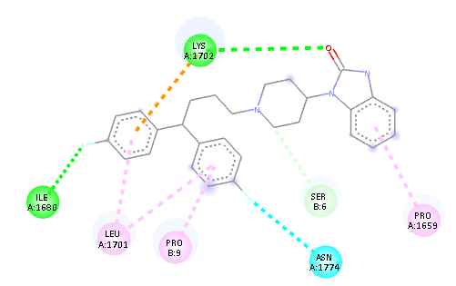 The image shows a molecular docking or protein-ligand interaction diagram likely picturing a binding pocket of a protein and key amino acid residues interacting with a ligand. The central hexagonal ring structure could be the ligand, an aromatic compound, surrounded by residues such as VAL A:1703 , ILE A:1860, LEU A:1701, PRO B:9, SER B:6, ASN A:1874, and PRO A:1659. Different interaction types are designated by the colored lines: green dashed lines indicate hydrogen bonding interactions (for example, with SER B:6), orange lines possibly designate hydrophobic interactions (for example, with VAL A:1703), and pink lines may represent π-π stacking or other aromatic interactions (for example, with PRO A:1659). The arrangement of residues in space around the ligand suggests a well-defined binding pocket stable through a combination of polar and non-polar interactions that stabilize the ligand and are essential for understanding the protein's function or designing inhibitors for drug discovery.