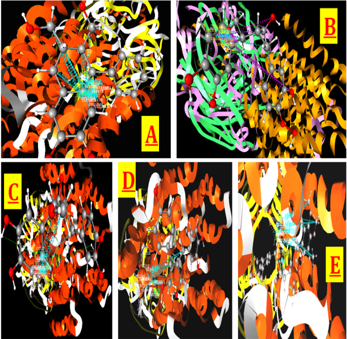 Figure 5: Docking poses of phyllanthus compounds with X-ray Crystal structure of a human GABA receptor, the GABA-A R?β3 homopentamer receptor (PDB Code: 3COF). Interaction Poses of (A) Diazepam, (B) Phyllanthin, (C)Hypophyllanthin, (D)Niranthin, (E) Isocolaragin.