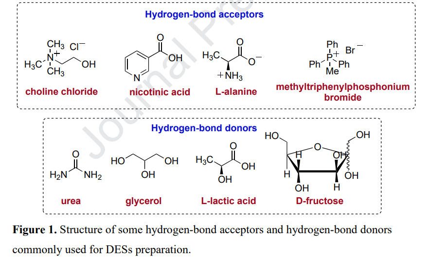 From a thermodynamic perspective, the term "deep" in deep eutectic solvents (DESs) should technically apply only to mixtures with an eutectic point significantly lower than that of an ideal liquid mixture. DESs are typically binary or ternary systems consisting of a hydrogen bond donor and a hydrogen bond acceptor, which form strong hydrogen bonds that reduce the lattice energy and lower the melting point. Some DESs don't have a distinct melting point, showing glass transitions instead, and are referred to as low-transition-temperature mixtures (LTTMs). DESs are often compared to ionic liquids (ILs) due to similar properties, like low vapor pressure, high thermal stability, non-flammability, and conductivity. However, DESs are more environmentally friendly, as their components—such as choline chloride, urea, and glycerol—are renewable, biodegradable, and low in toxicity. From a thermodynamic perspective, the term "deep" in deep eutectic solvents (DESs) should technically apply only to mixtures with an eutectic point significantly lower than that of an ideal liquid mixture. DESs are typically binary or ternary systems consisting of a hydrogen bond donor and a hydrogen bond acceptor, which form strong hydrogen bonds that reduce the lattice energy and lower the melting point. Some DESs don't have a distinct melting point, showing glass transitions instead, and are referred to as low-transition-temperature mixtures (LTTMs). DESs include eutectic mixtures of Lewis or Brønsted acids and bases, which can contain various ionic species. DESs are often compared to ionic liquids (ILs) due to similar properties, like low vapor pressure, high thermal stability, non-flammability, and conductivity. However, DESs are more environmentally friendly, as their components—such as choline chloride, urea, and glycerol—are renewable, biodegradable, and low in toxicity. DESs are increasingly replacing volatile organic compounds (VOCs) due to their low ecological impact, cost-effectiveness, customizable properties, and ease of preparation. However, the exact structure of DESs in their liquid state is still not well understood. Hydrophilic DESs, in particular, are notable for their strong hydrogen-bonding networks and the role water plays in modifying their structure and interactions with biological macromolecules like proteins and nucleic acids. Initially studied for metal electrodeposition and extraction processes, DESs have gained attention in areas such as solar energy, photosynthesis, and electrochemistry.