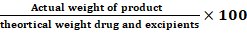 % Yield = Actual weight of product theortical weight drug and excipients×100
