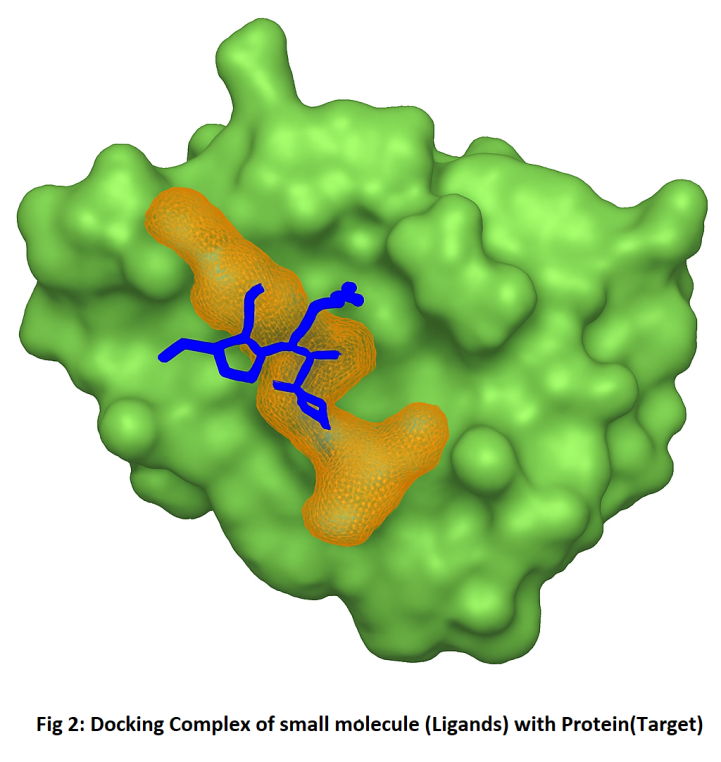 Molecular docking is a key tool in structural molecular biology and computer-assisted drug design. The goal of ligand protein docking is to predict the predominant binding mode(s) of a ligand with a protein of known three-dimensional structure. Molecular docking is usually performed between a small molecule and a target macromolecule. This is often referred to as ligand– protein docking, but there is growing interest in protein–protein docking. For performing molecular docking, primarily two types of approaches are used. One of the approaches employs computer simulations in which energy profiling is estimated for ligand target docked conformer whereas, second approach utilizes a technique that calculates surface complementary human ligand and target. Molecular docking has a wide variety of uses and applications in drug discovery, including structure–activity studies, lead optimization, finding potential leads by virtual screening, providing binding hypotheses to facilitate predictions for mutagenesis studies, assisting x-ray crystallography in the fitting of substrates and inhibitors to electron density, chemical mechanism studies, and combinatorial library design [10].To determine their tentative binding parameter. This establishes raw data for the rational drug designing for new agents/existing agent with better efficacy and more specificity.[15]