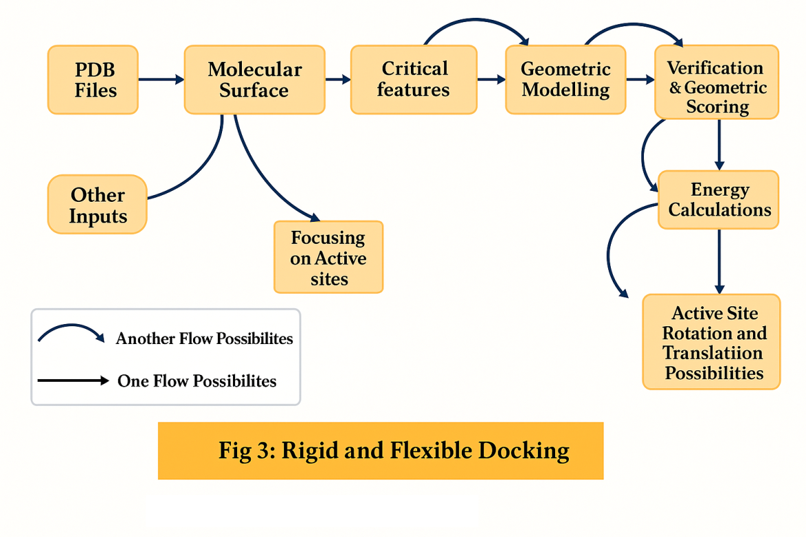 The setup for a ligand docking approach requires components a target protein structure, the molecules of interest or a database containing existing o components a target protein structure, the molecules virtual compounds for the docking process, and a computational framework that allows the implementation of the desired docking and scoring procedures. Most docking algorithms assume protein to be rigid; the ligand is mostly regarded flexible. Beside the conformational degree of freedom, the binding pose in proteins binding pocket must be taken in to consideration. Docking can be performed by rigid molecules or fragments in to protein active site using different approaches like the clique-search, geometric hashing, pose clustering. Typically, the structure most likely to be dominant further adjusted by adding or removing hydrogens provided approximate pKa values. It is important to make sure that accurate atom typing occurs.[15]