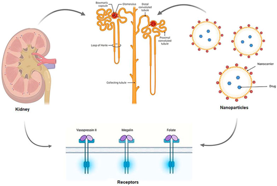 Drug-carrying nanoparticles are conducted to the afferent arteriole through the renal artery, and are in the blood or filtered out of the blood by the kidneys in the glomerular capillaries to be processed. Renal elements like the endothelial cells, GBM and glycocalyx are all adjustable to help in the process of selecting NPs to be used in the process of filtration. After being filtered, NPs are able to respond to the podocytes within the lumen of the Bowman. The NPs are carried to the proximal tubule, where they are taken up by proximal epithelial cells and could be reabsorbed.