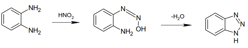 Another method of synthesizing benzotriazole involves direct action of nitrous acid on o-phenylenediamine and by the hydrolysis of an acylated or aroylated benzotriazole which has been previously prepared by the action of nitrous acid on the corresponding mono acylated or aroylated o-phenylenediamine.