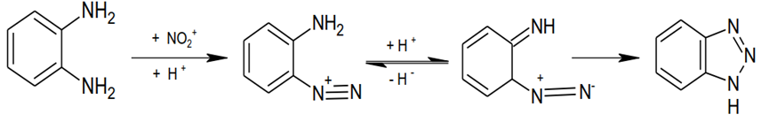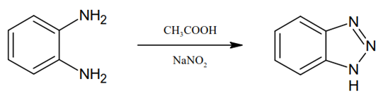 Benzotriazole is commonly synthesized by diazotization process using benzene-1,2-diamine with sodium nitrite and acetic acid. The reaction involved the simple heating the reagents together. Conversion of the diamine into the monodiazonium derivative is followed by spontaneous cyclization [3].