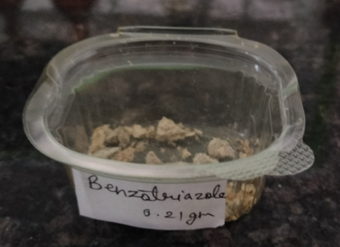 In a round bottom flask, 10.8g of ortho phenylenediamine was dissolved in a mixture of 12g glacial acetic acid and 30 mL of water, with the aid of moderate heat. The clear solution was cooled to 15°C and stirred on a magnetic stirrer. To the solution was added slowly a solution of 7.5g sodium nitrite in 15 mL water. The temperature of the solution increases to 85°C and the mixture was allowed to cool. The color of the solution changes while cooling and the mixture was continued stirring till temperature reaches 30°C. The mixture was then chilled in an ice-bath for 30 min. The product was collected by vacuum filtration and washed thrice with cold water. The product was recrystallized using hot water to obtain the benzotriazole [9].