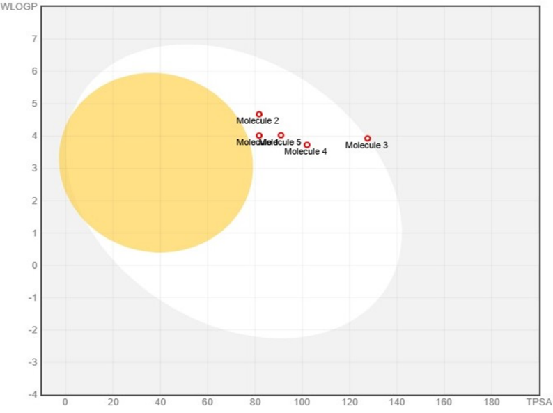 Physicochemical property is an important parameter of a molecule that influences efficacy, safety or metabolism which could be predicted by using Lipinski’s rule of five, Veber’s rule or Muegge’s rule. We have used the Lipinski’s rule that defines an orally active drug, which confirms to the number of hydrogen bonds acceptor (HBA) ≤ 10, hydrogen bonds donor (HBD) ≤ 5, molecular weight (MW) < 500 Da and Log P (the logarithm of octanol water partition coefficient) ≤ 5. The physicochemical properties include molecular weight, number of the rotatable bonds (NRB), HBA, HBD, molar refractivity (MR, in m3.mol-1) and polar surface area (PSA, in Å). The compounds exhibited drug likeliness as they presented no violations in Lipinski, Ghose, Veber, Egan and Muegge rules but could not present lead likeliness as they had molecular weight of more than 350 and XlogP3 more than 3.35. The other two significant determinant are lipophilicity and solubility that are monitored for favorable drug development. Table 5.4 reveals that all compounds meet every single criterion of Lipinski’s rule of five and thus fully obey the rule. Consequently, all the investigated compounds present a good drug-likeness profile, since they are predicted to be easily absorbed and have good permeability and bioavailability. The boiled egg diagram is a tool to predict the BBB permeability of molecules. It was observed that none of the molecules were permeating the BBB and exhibited high absorption in the gastrointestinal region (Figure 5.7).