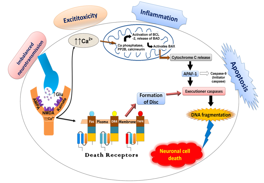 The pathophysiology of epilepsy involves conversion of a normal network into a hyper excitable network. It is associated with a group of processes which disturb extracellular ion homeostasis, alter energy metabolism, change receptor function and alter transmitter uptake. In CNS, the brain consists of nerve cells and these nerve cells communicate and interact with each other through axons by discharging tiny electrical impulses. The brain along with nerve cells works on the phenomenon of electricity. The output of these electrical impulses is the release of chemicals called neurotransmitters from the axon end which in turn interacts with the next cell. These chemicals (neurotransmitters) can be excitatory or inhibitory. The balance of these excitatory and inhibitory impulses is very important to maintain the action potential of neurons [8]. Release of excessive excitatory glutamate overactivates NMDA receptors resulting in excessive in?ux of Ca2+ ions. The over?ow of Ca2+ levels caused deteriorate condition which activates cytoplasmic proteases (such as calpain I), which proteolysis cytoskeletal and other proteins, neuronal nitric oxide synthase (nNOS), which increases nitric oxide production in turn generating the free radical peroxynitrite that damages DNA which ultimately lead to neuronal cell death (Figure 1.2).