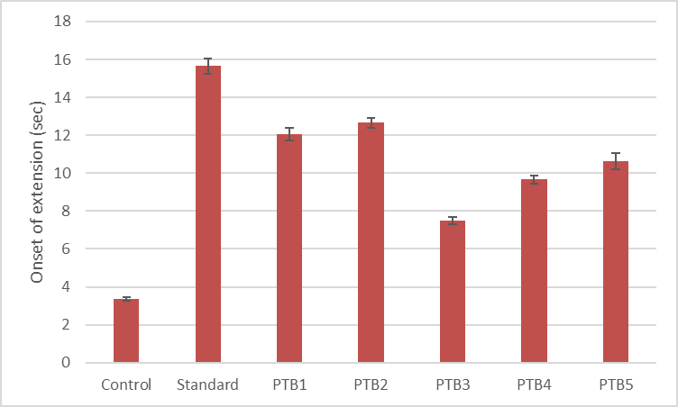 the onset of extension of hind limb was significantly reduced in standard, PTB1, PTB2 and PTB5 (p<0.001) in comparison to the control group. PTB3 and PTB4 were able to reduce the onset (p<0.05). These results were found to be almost in consonance with the boiled egg predictions were molecules 1, 2 and 5 were displaying physicochemical features closed to the yolk region representing blood brain barrier. Also, as the ADMET properties were predicted, the compounds PTB3 and PTB4 were showing 100% gastrointestinal absorption.