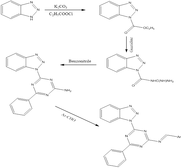 Anhydrous K2CO3 was added to a solution of the benzotriazole and ethylchlorformate dissolved in anhydrous DMF in a round bottom flask and allowed the reaction to refluxed for 1-2 hr. After the completion of reaction checked by TLC, crushed ice was added into reaction mixture compounds got ppt out. Filter the solid and washed with cold water [10].