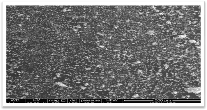 Morphology of Microspheres Was examined by Scanning electron microscopy. Scanning electron micrograph of optimized batch of microspheres shows that the surface of microparticles was appearing somewhat rough & particle are present like clusters having varying size & shape