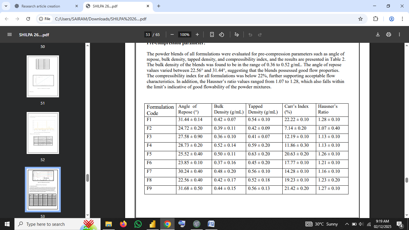 Table no 2: Pre-Compression Parameters for Formulations F1–F9