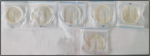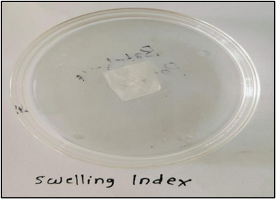 The patch was placed on graph paper beneath a petri dish with buffer. Swelling was measured visually. All patches showed slight swelling, with F5 and F6 showing optimal, uniform expansion19.