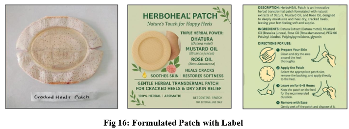 Cracked heels are partial-thickness wounds caused by dryness and skin thickening, common in high-pressure areas like the heel edge1. They can lead to pain, infection, and ulcers, especially in the elderly or diabetics. If untreated, they may progress to serious complications like cellulitis or amputation. Common symptoms include pain, bleeding, itching, and emotional distress due to their appearance. These occur due to imbalances in skin hydration, lipid content, pH, and keratin production. This study aims to develop a herbal transdermal patch that combines traditional remedies with modern delivery methods for effective management of cracked heels2,3. Datura and mustard oil both offer valuable therapeutic benefits, especially in traditional medicine. Datura is known for its anti-inflammatory, analgesic, and antispasmodic properties, making it useful for relieving pain and swelling. It has been used topically to ease muscle and joint discomfort4. Mustard oil, on the other hand, is widely recognized for its warming effect, which promotes blood circulation. It also has antibacterial, antifungal, and anti-inflammatory actions, making it helpful in treating skin conditions, soothing cracked heels, and reducing localized pain5. Together, they can support healing and provide relief in topical applications. The present study aimed to develop and evaluate a herbal transdermal patch containing Datura metal and mustard oil for the effective treatment of cracked heels by enhancing healing, reducing inflammation, and improving skin hydration.
