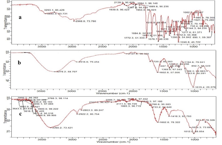 Figure 1: FTIR spectrum of a) Amoxicillin, b) Xanthan gum and c) Formulation SF13.