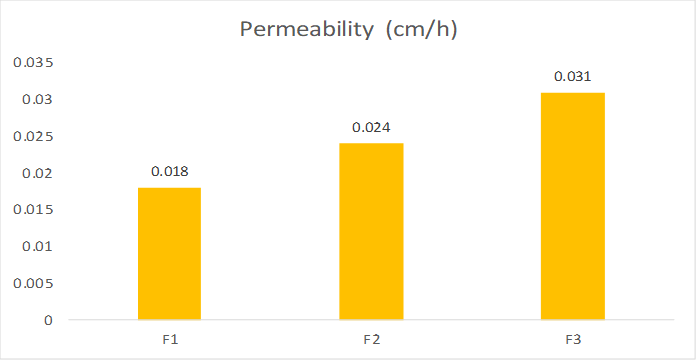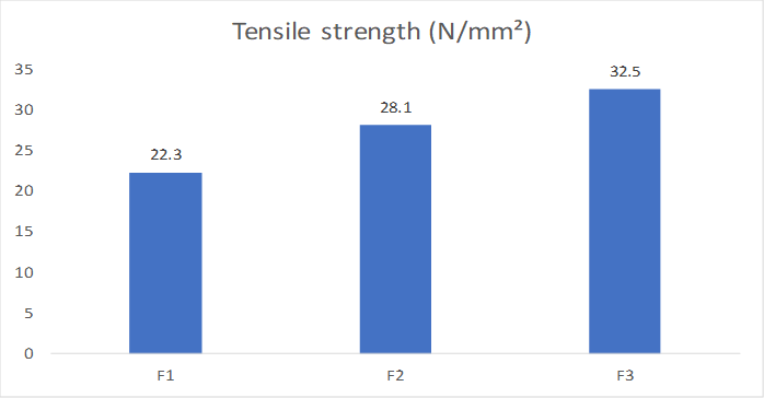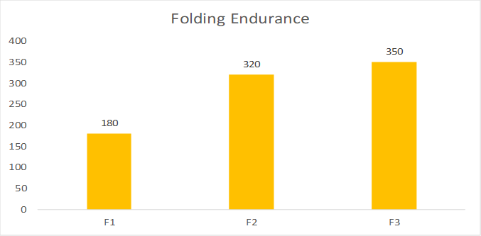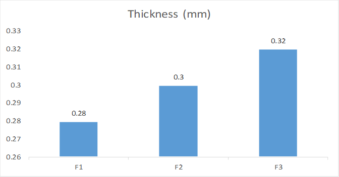 Tensile strength (N/mm²) was highest for F3 (32.5), followed by F2 (28.1) and F1 (22.3). Percentage elongation (%) also followed the same trend: F3 (18.6), F2 (15.2), F1 (11.5). Folding endurance (number of folds) was 180 (F1), 320 (F2), and 350 (F3), showing that F3 is the most flexible and robust formulation.