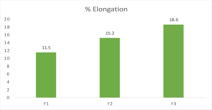 Formulation F3 exhibited the highest tensile strength and elongation, indicating excellent mechanical properties suitable for transdermal application. The enhancement in mechanical strength is directly related to optimal polymer interaction and the plasticizing effect of PEG 400, which improved flexibility without compromising strength.