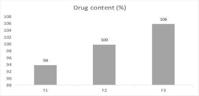 The drug content of all formulations was within the range of 96.2 ± 1.4% to 99.5 ± 1.2%, indicating uniform distribution of diclofenac sodium within the polymeric film. The uniform drug content also reflects effective mixing and solvent evaporation control during the formulation process. Among all formulations, F3 exhibited the highest uniformity (99.5 ± 1.2%), confirming the compatibility and homogeneity of the drug and extract within the polymer blend.