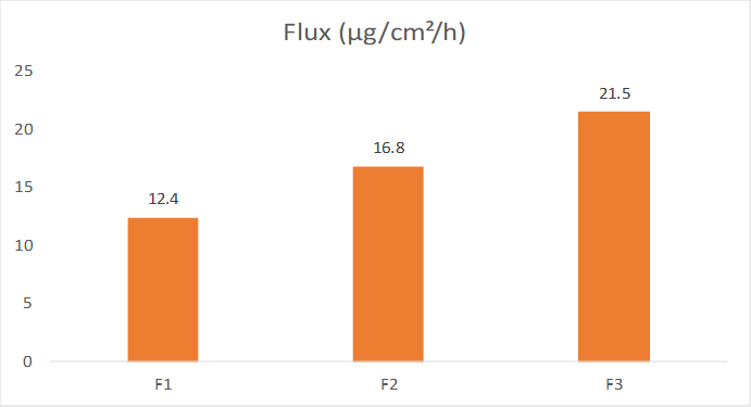 In conclusion, F1 was mechanically strong but limited in drug permeation, F2 offered moderate release with improved transport, and F3 achieved the most favorable performance by combining mechanical integrity, controlled release, and significantly enhanced transdermal flux. The Franz diffusion cell data thus validate F3 as the optimal formulation for further development in chronic pain management.