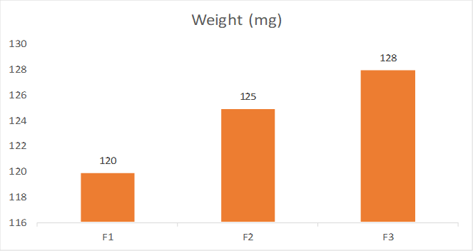 The thickness of the patches ranged between 0.21 ± 0.01 mm (F1) and 0.26 ± 0.02 mm (F3). The uniform thickness across all formulations suggested consistent polymer dispersion during casting. The average weight of the patches ranged between 126.5 ± 1.8 mg and 132.2 ± 2.1 mg, confirming uniformity in drug and polymer distribution. These results indicate that the solvent casting technique was appropriate for producing reproducible and homogeneous transdermal films.