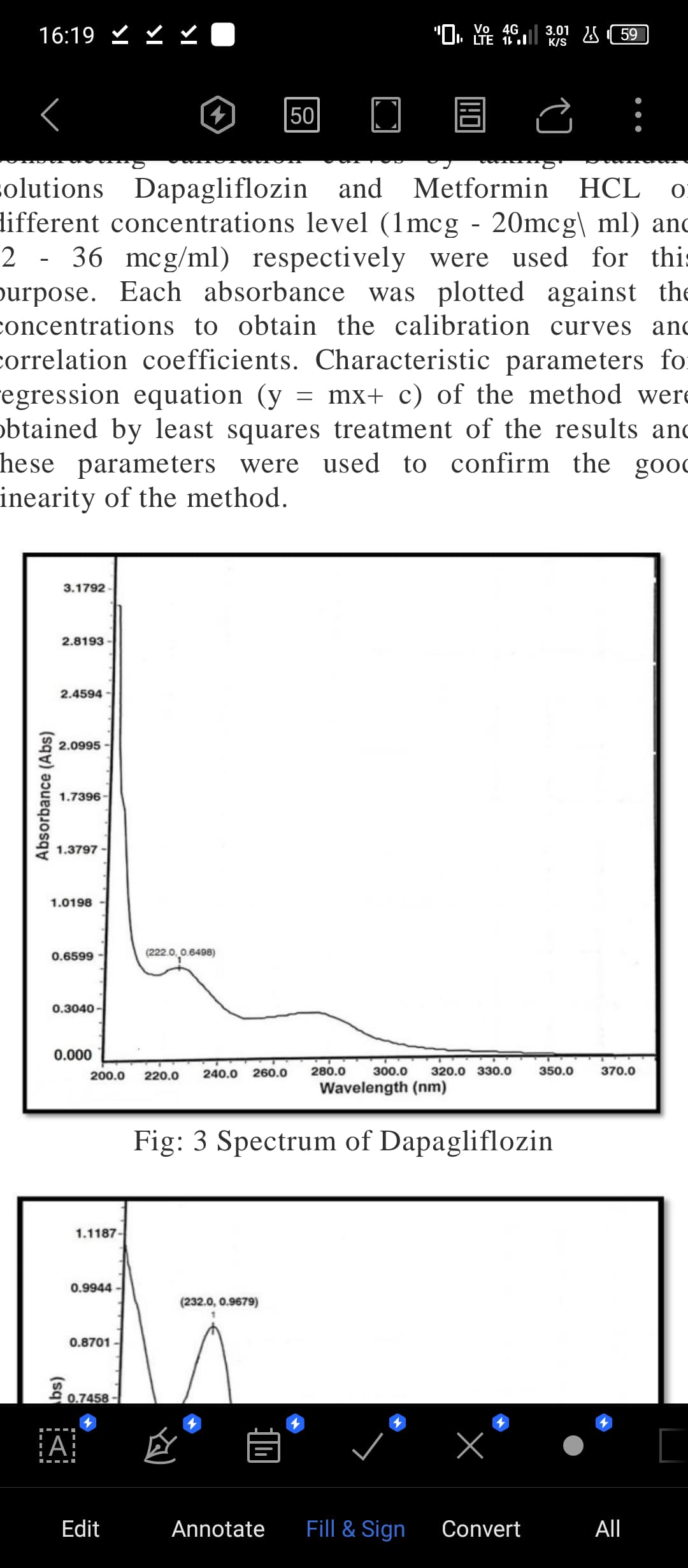 A standard UV solution was analyzed within the range of 200 to 400 nm, showing an absorption peak at 222 nm. The absorption spectrum for Dapagliflozin is presented in Figure 3.3.