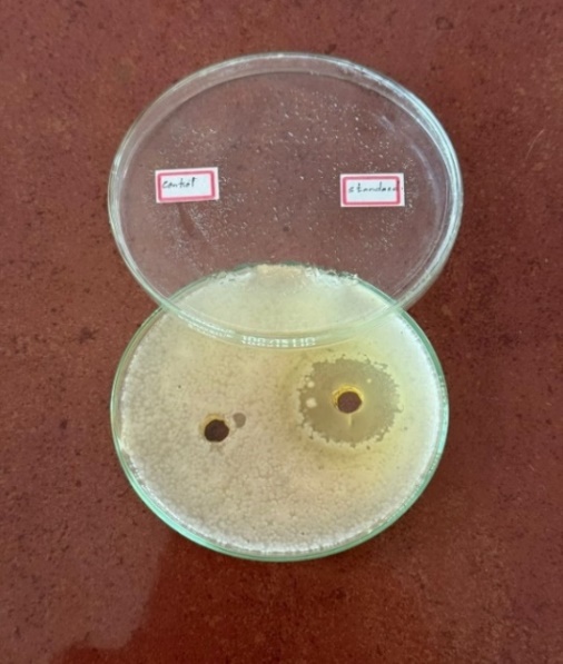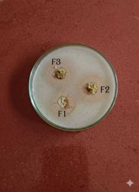 Antimicrobial study: The antimicrobial efficiency of the formulation was studied using gram negative Escherichia coli by agar well diffusion test. Sterilized glassware and nutrient agar medium were used, plates were inoculated, wells of 6 mm diameter were filled with the formulation, incubated for 24 hrs at 37°C, and examined for inhibition of bacterial growth.