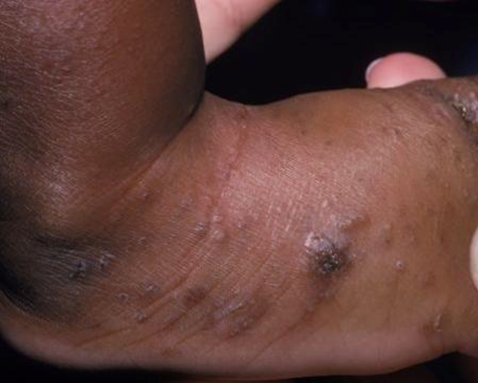 Occasionally, scabies manifests in atypical forms (70) that are more challenging to detect than the classic forms, perhaps increasing the likelihood of outbreaks. The face, scalp, palms, and soles are frequently affected by atypical presentations in babies. Elderly people have atypical papular scabies, immunocompromised individuals have localized or generalized crusted scabies, and patients with superinfected scabies have impetigo