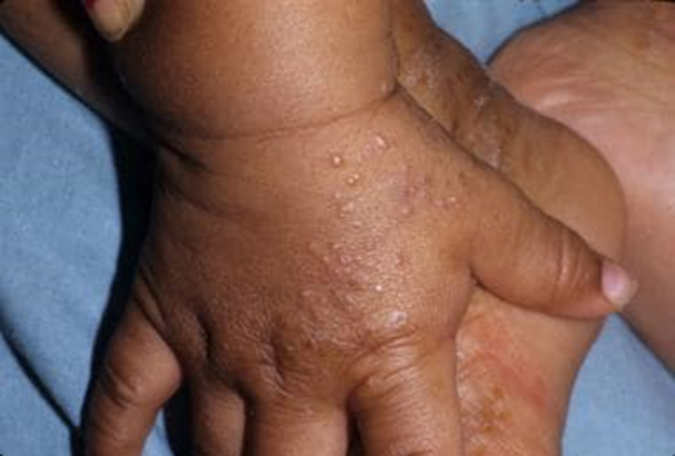 Infants and young children. Frequently, they are misdiagnosed. Lesions in clinical practice are primarily found on the hands, feet, and body folds and consist of more vesicles, pustules, and nodules. Patients may exhibit poor feeding and irritability (51). Histologically, there may be a thick infiltrate of Langerhans cells, which could lead to a misdiagnosis as Langerhans cell histocytosis.