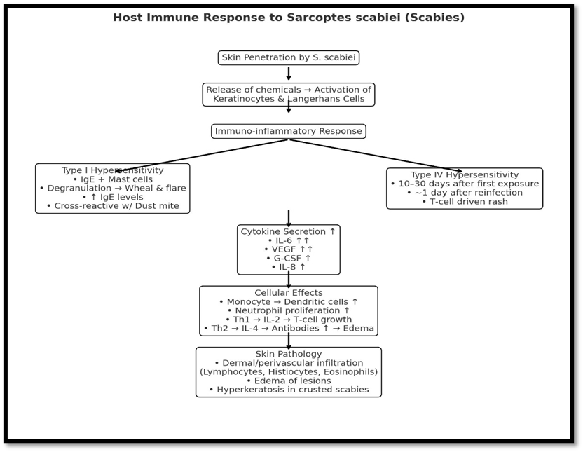 After penetrating the skin, S. scabiei releases chemicals in reaction to kerati-nocytes and Langerhans cells (30), starting an immunological inflammatory response involving several cell types (31).