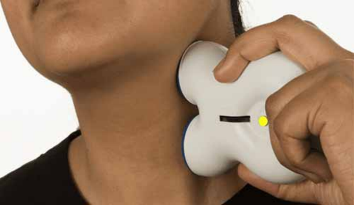 Stimulates the cervical branch of the vagus nerve through the neck skin.