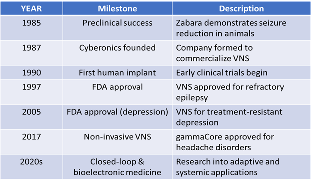 In conclusion, the history of VNS spans four decades but has already accomplished a great deal. To date, VNS has gained approvals from the FDA for medication-refractory epilepsy, treatment-resistant depression, obesity, post-stroke motor rehabilitation, and migraine and cluster headache. The development of novel non invasive forms of VNS promises to further advance the field’s evolution.