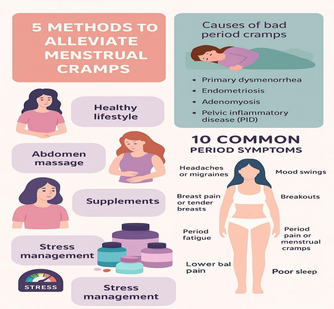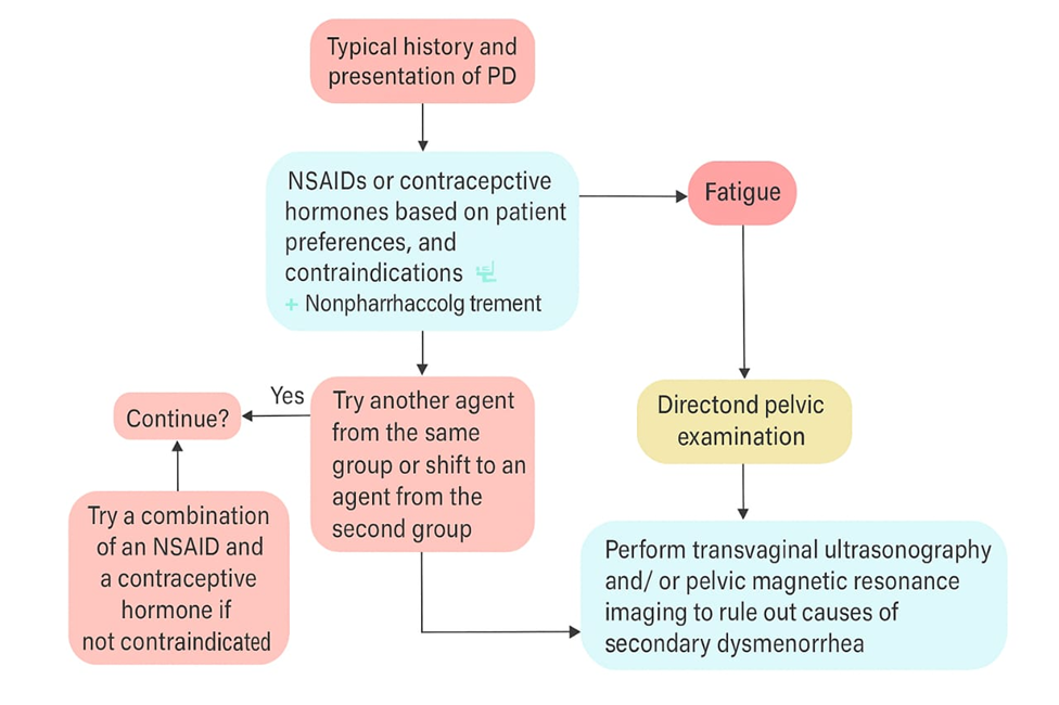 Effective management of dysmenorrhea involves a multidimensional approach that combines pharmacological, non-pharmacological, and lifestyle interventions. Pharmacologically, nonsteroidal anti-inflammatory drugs (NSAIDs) remain the first-line therapy, acting by inhibiting cyclooxygenase enzymes and reducing prostaglandin production. Hormonal contraceptives, including oral pills, intrauterine systems, and injectables, offer additional benefits by suppressing ovulation and stabilizing endometrial growth. In refractory cases or secondary causes, surgical interventions may be required. Complementary methods such as heat therapy, regular physical exercise, dietary modifications, stress reduction, and the use of alternative therapies like acupuncture or herbal medicine have also shown supportive benefits. A personalized treatment plan, tailored to symptom severity, individual preference, and the presence of comorbidities, is essential for optimal results.