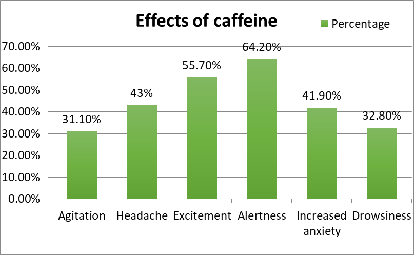 The effects of caffeine consumption were analyzed in detail; 31.1% of the participants who were routinely consuming caffeine, were found to feel agitated and unable to carry their tasks in its absence. According to the study, the majority confirmed consumption of caffeine before bed interfered with their sleep pattern and only 35.9% experienced an improvement in academic performance with 32.6% resorting to an elevated level of caffeine especially during the exam periods. The respondents were assessed for characteristic reaction to caffeine consumption (Table 4); on which they were found to experience headache (43%), excitement (55.7%), exceptional alertness (64.2%) at large. (Fig.No6)