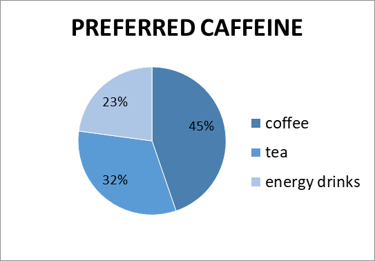 To analyze the impact of caffeine on young adults, consumption frequency of these beverages in the last 30days was enquired, of which nearly 72% reported of caffeine consumption on a daily basis while the rest 13% claimed to have casually consumed atleast one of the caffeinated products during the time. The preferred choice of caffeine was found out to be coffee 45%, followed by tea 32% and then energy drinks 23%. (Fig. No2)