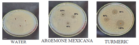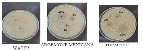 The antibacterial activity of Argemone Mexicana extract and turmeric extract was evaluated against Escherichia coli by measuring the Zone of Inhibition (ZOI) after 24 and 48 hours.