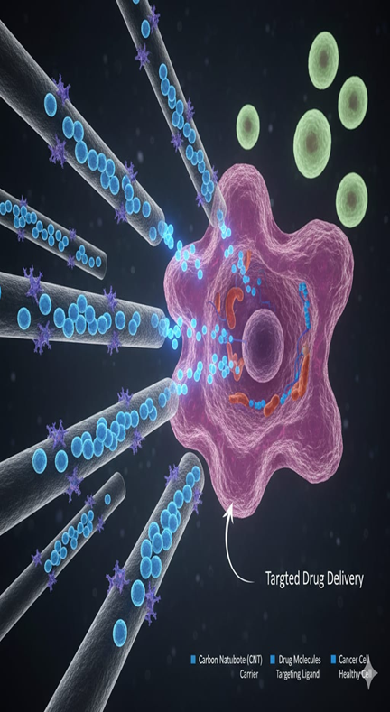 Carbon nanotube nanocarriers (CNTs) are long, tube-like structures with unique physical, chemical, and biological properties, making them valuable for drug delivery. They have been used to carry anticancer drugs such as doxorubicin, paclitaxel, methotrexate, and even small interfering RNAs (siRNAs). Combining siRNA with chemotherapy offers strong potential in cancer treatment, but the main challenges include precise targeting, protecting the cargo, and ensuring release at the right site. CNTs are especially useful because they have a large surface area, strong adsorption ability, high durability, easy functionalization, and excellent uptake by cells. Their surfaces can also be modified through covalent or noncovalent bonding, making them a highly versatile nanomaterial.