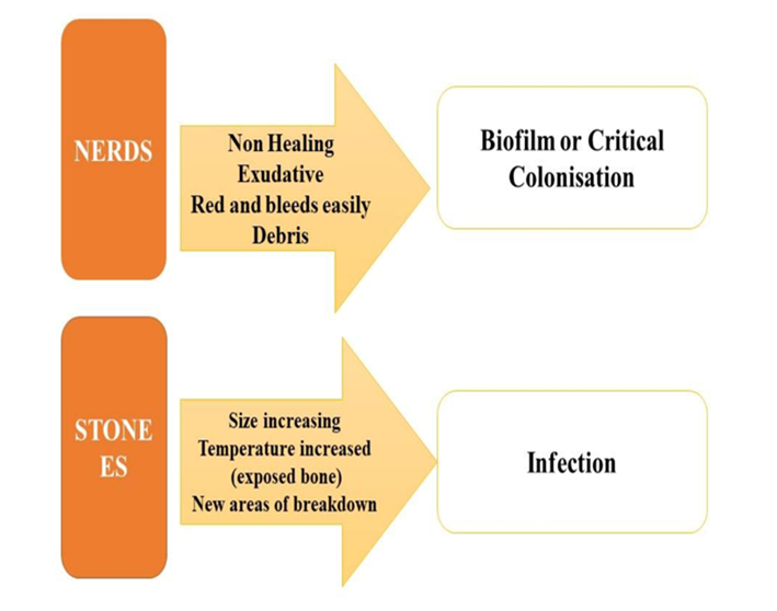 Secondly, it is necessary to evaluate the injuries for microbial contamination. Common infection symptoms including fever, discomfort, swelling, and redness may not always be apparent. For identifying chronic wounds that are infected, two mnemonics are suggested: NERDS, which has a sensitivity of 73% and a specificity of 80.5% when three criteria are satisfied, and STONEES, which has a sensitivity of 90% and a specificity of 69.4% when at least three indications are present. The wound is extensively colonized or has biofilm when NERDS criteria are met. The existence of STONEES signifies that the chronic wound has an infection as shown in fig.4.